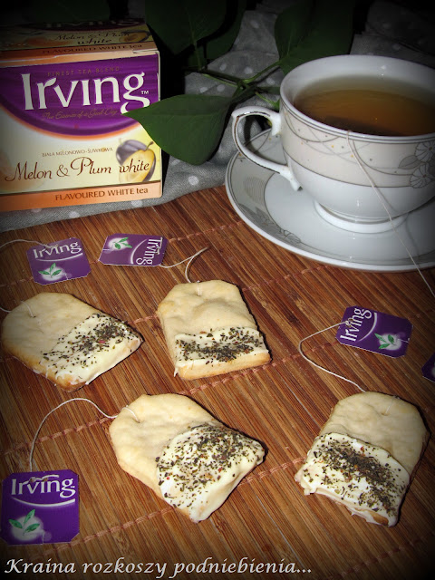 Kawy praktycznie wcale nie piję, ale jestem wielką miłośniczką herbat. Czarna, biała, czerwona, zielona, owocowa, liściasta i w torebkach. Mam ich mnóstwo i co chwilę kupuję jakieś nowe. Gdy zobaczyłam, że na Durszlaku jest organizowany konkurs na potrawę z wykorzystaniem jednej z herbat Irving, od razu wiedziałam, że muszę wziąć w nim udział. Na wygraną specjalnie nie liczę, ale już samo przygotowywanie herbacianego posiłku było dużą przyjemnością :):):) Biała herbata, biała czekolada i zniewalający aromat melona. Z takiego połączenia wyczarowałam niezwykle aromatyczne herbaciane pieguski. Rodzinny przepis na kruche ciasteczka odrobinę zmodyfikowałam poprzez dodanie naparu z białej herbaty Irving Melon & Plum White. Gotowe ciasteczka oblałam białą czekoladą i posypałam herbatą.